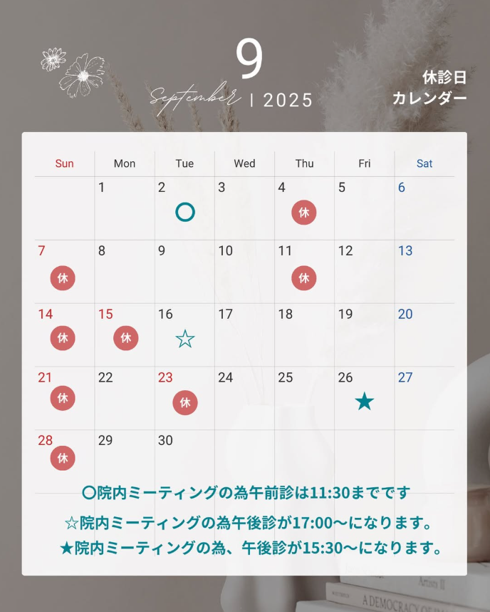 ◯2日(火) 院内ミーティングの為、午前診が11時30分までとなります。